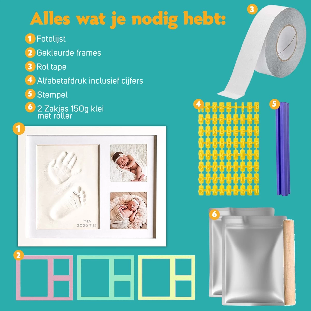 · Complete set – De set bestaat uit een fotolijst, klei roller, stempels, leuke symbolen, 2 zakjes klei van 150 gram per stuk en een rolletje tape. Hierdoor heb je alles in huis voor een mooie afdruk!