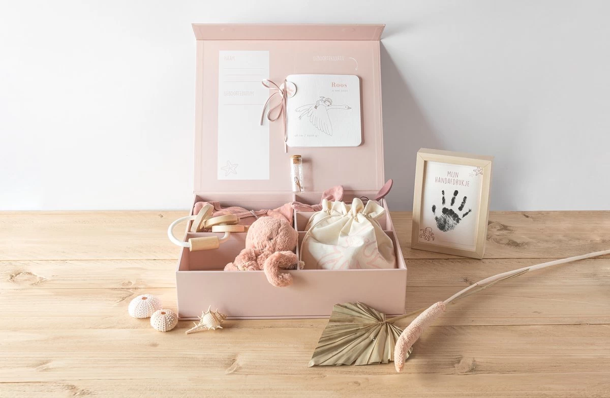 (Let op: het is de bedoeling dat je de memorybox zelf vult met babyspulletjes/herinneringen met behulp van de items die in de box zitten. Sommige foto’s zijn bedoeld ter inspiratie)