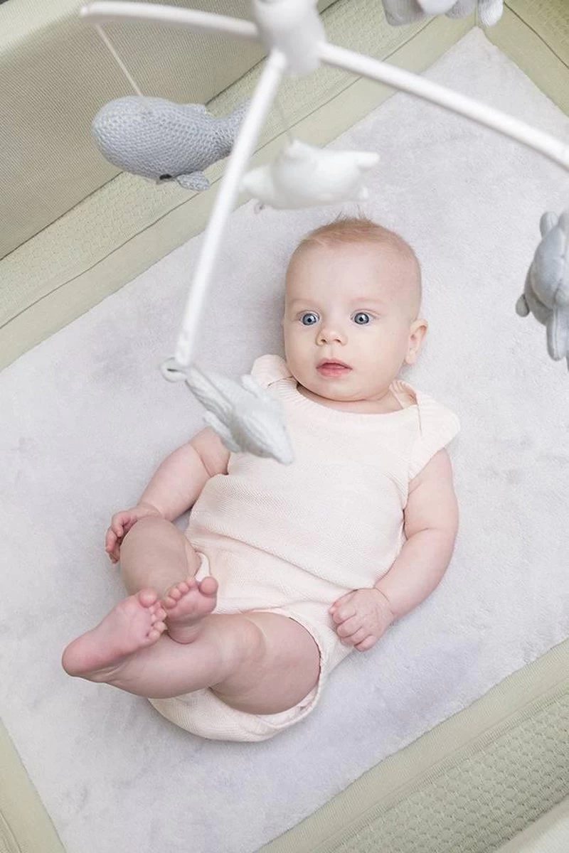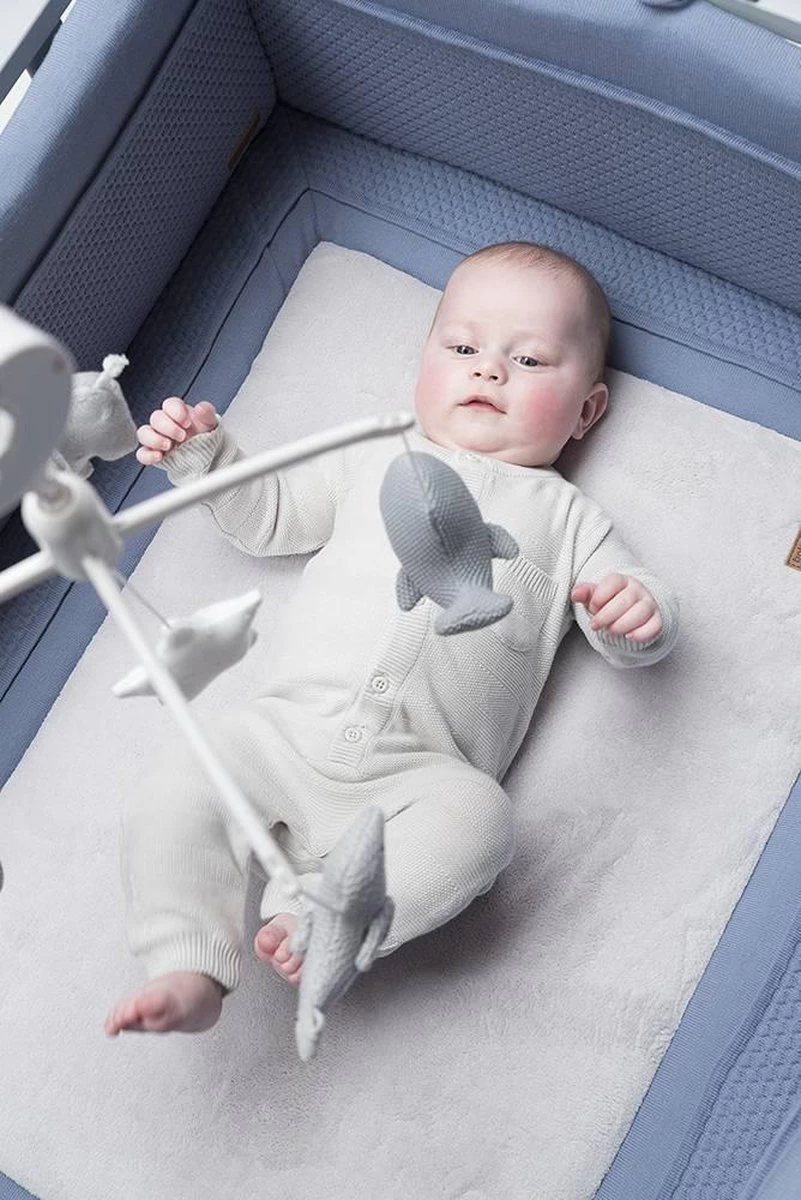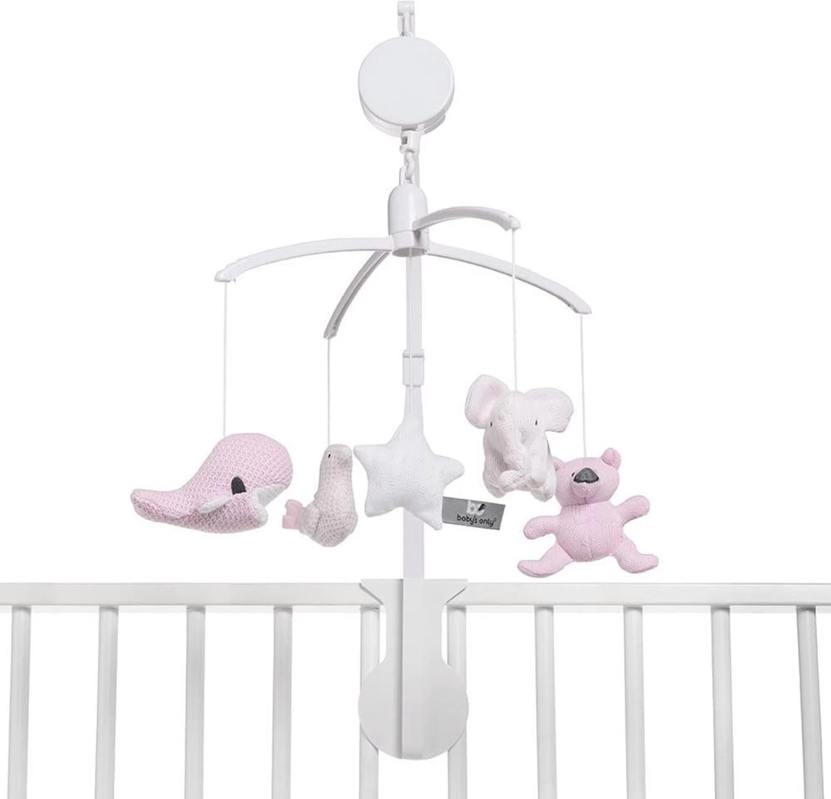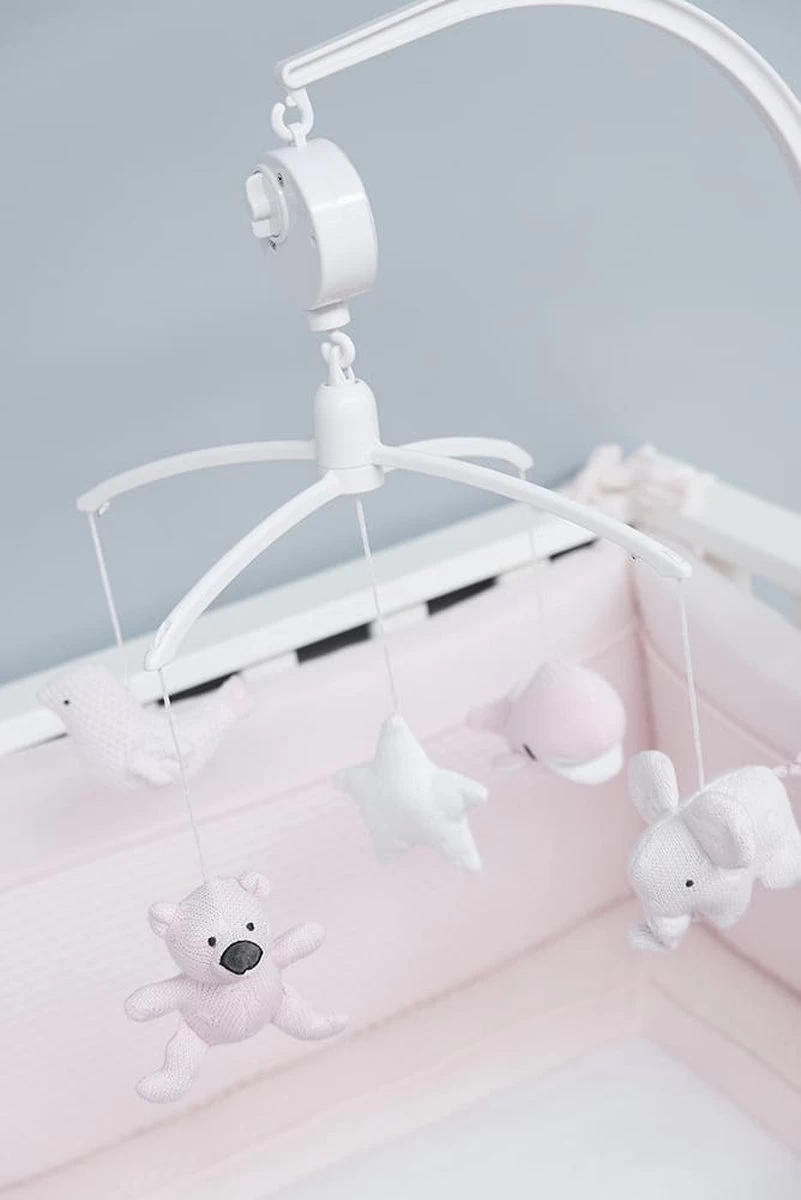 De bekende knuffels uit de collectie hangen in mini-uitvoering aan de Baby’s Only muziekmobiel roze. De gebreide dierenvriendjes bestaan uit een beer, olifant, walvis en vogel. In het midden hangt een vrolijke ster. Als je de muziekmobiel opdraait speelt hij het liedje It’s a small world. Door het gebruik van het breiwerk en de kleur roze uit de bestaande collectie, matcht deze Baby’s Only muziekmobiel perfect bij de box of het babybedje.