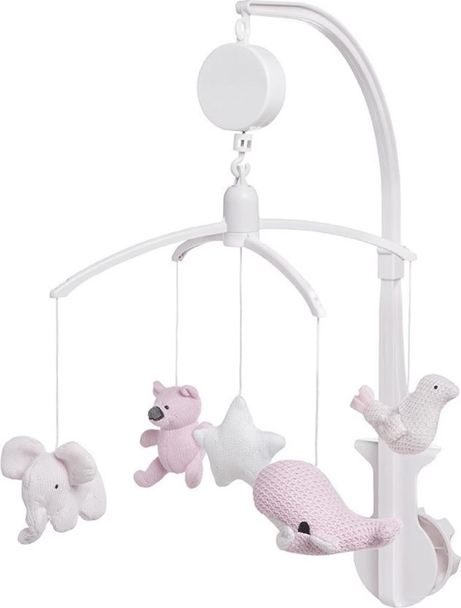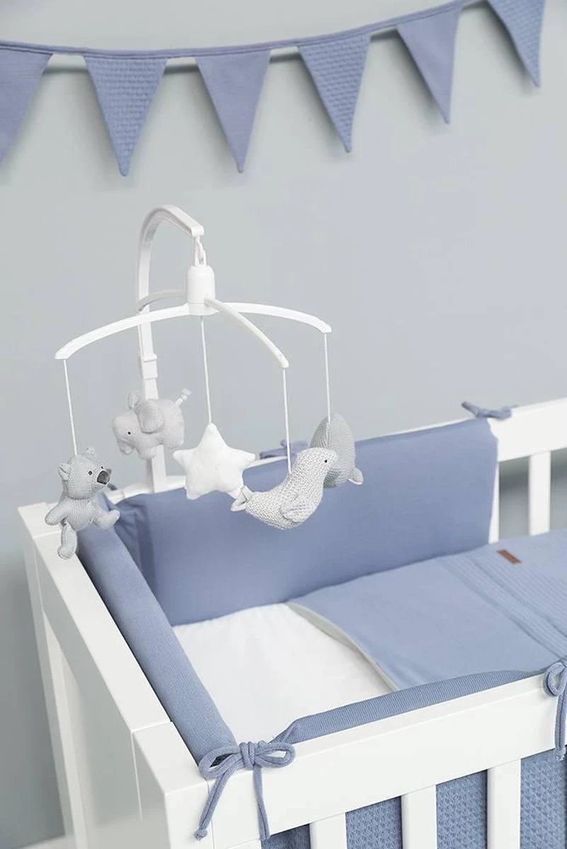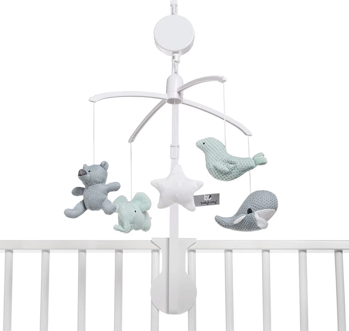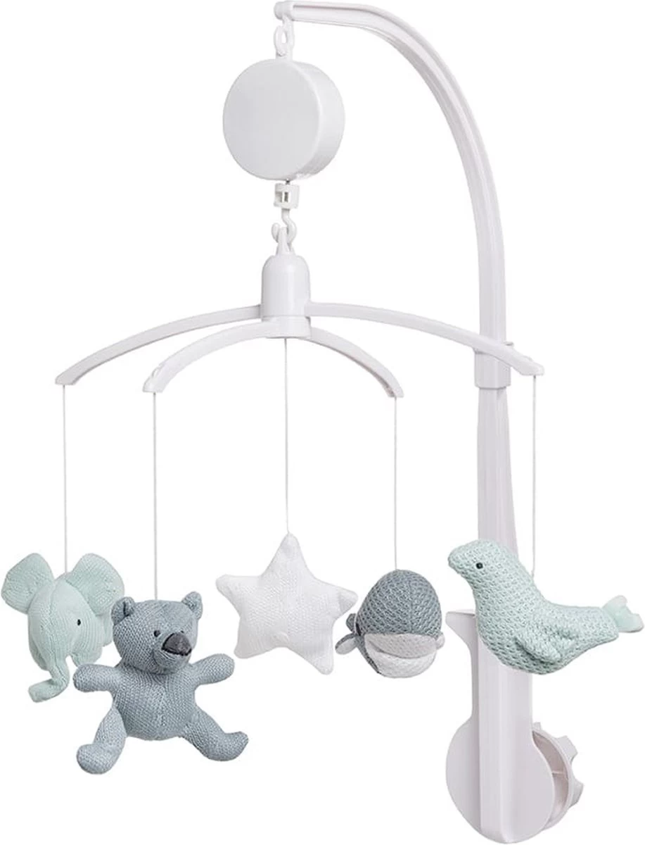 De bekende knuffels uit de collectie hangen in mini-uitvoering aan de Baby’s Only muziekmobiel stonegreen/mint/wit. De gebreide dierenvriendjes bestaan uit een beer, olifant, walvis en vogel. In het midden hangt een vrolijke ster. Als je de muziekmobiel opdraait speelt hij het liedje It’s a small world. Door het gebruik van het breiwerk en de kleuren mint/stonegreen uit de bestaande collectie, matcht deze Baby’s Only muziekmobiel perfect bij de box of het babybedje.
