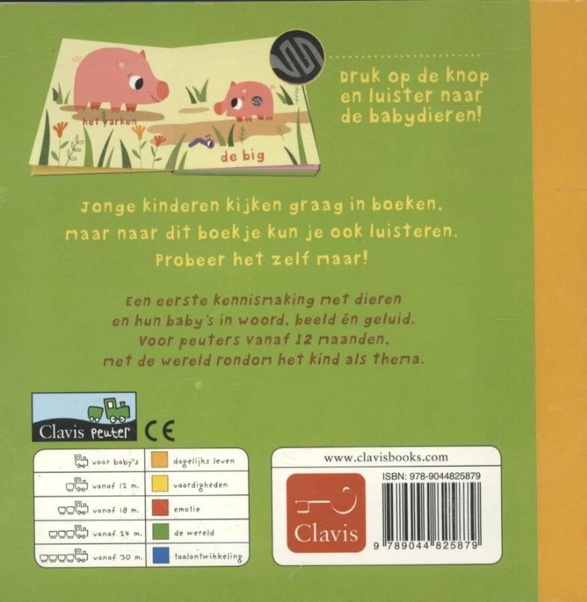 Jonge kinderen kijken graag in boeken, maar naar dit boekje kun je ook luisteren. Probeer het zelf maar! Een eerste kennismaking met dieren en hun baby s’ in woord, beeld én geluid.