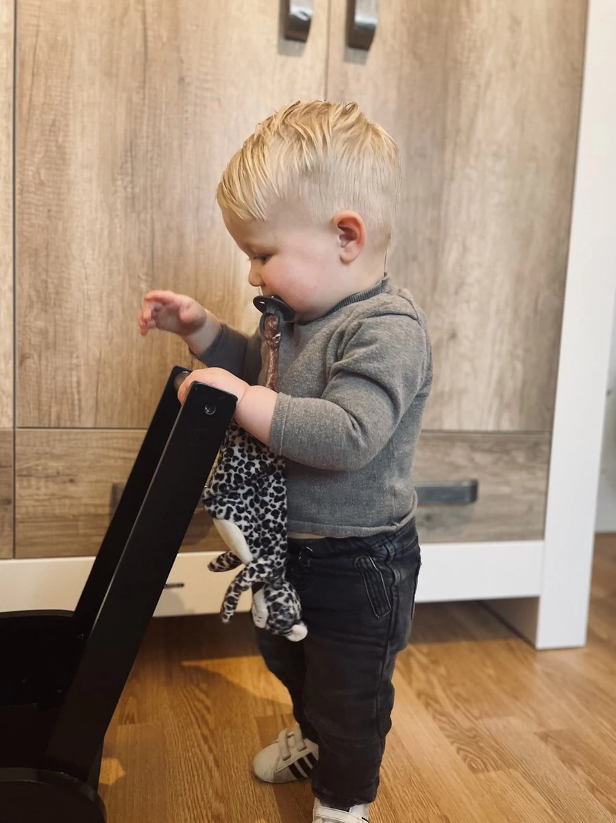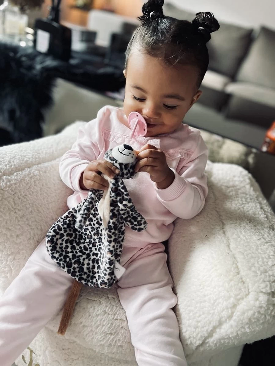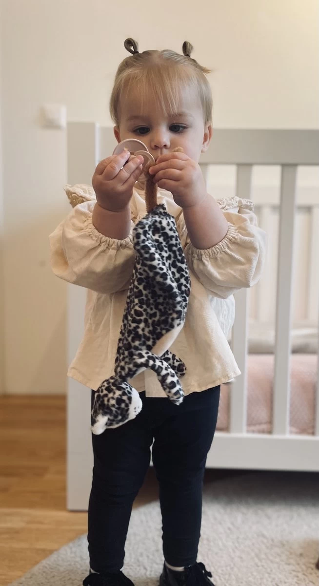 Leopard Lou heeft een extra lange staart zodat er een speen aan bevestigd kan worden en deze dus ook te gebruiken is als speendoekje of om er gewoon lekker mee te friemelen.