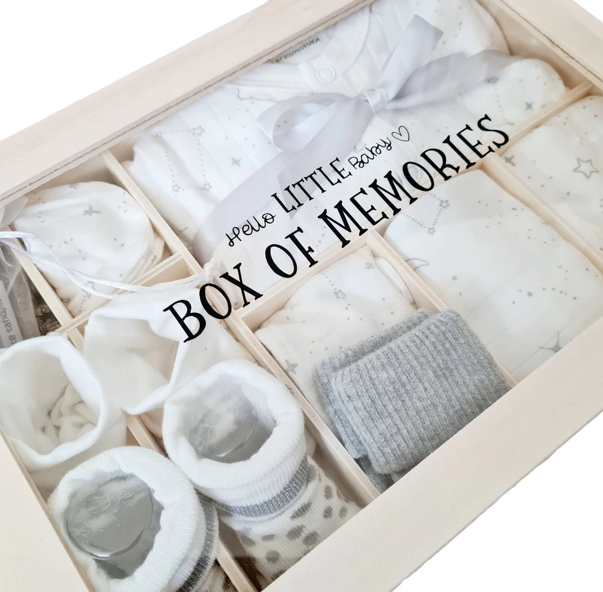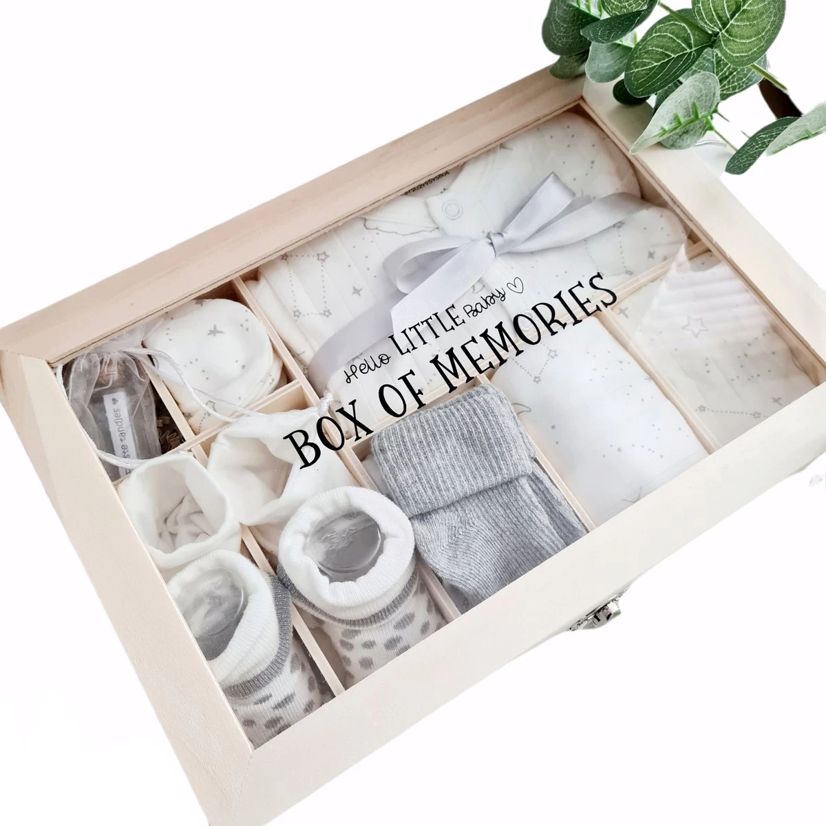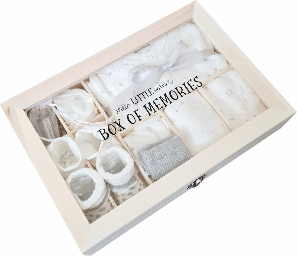 – Houten memory kist met vakverdeling om later kleine herinneringen van het kindje te bewaren