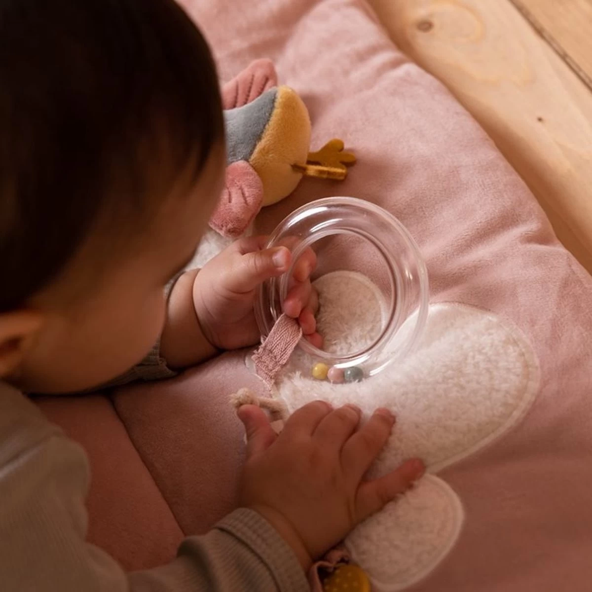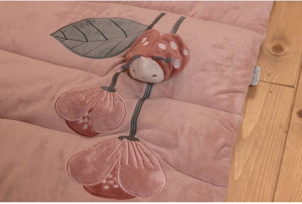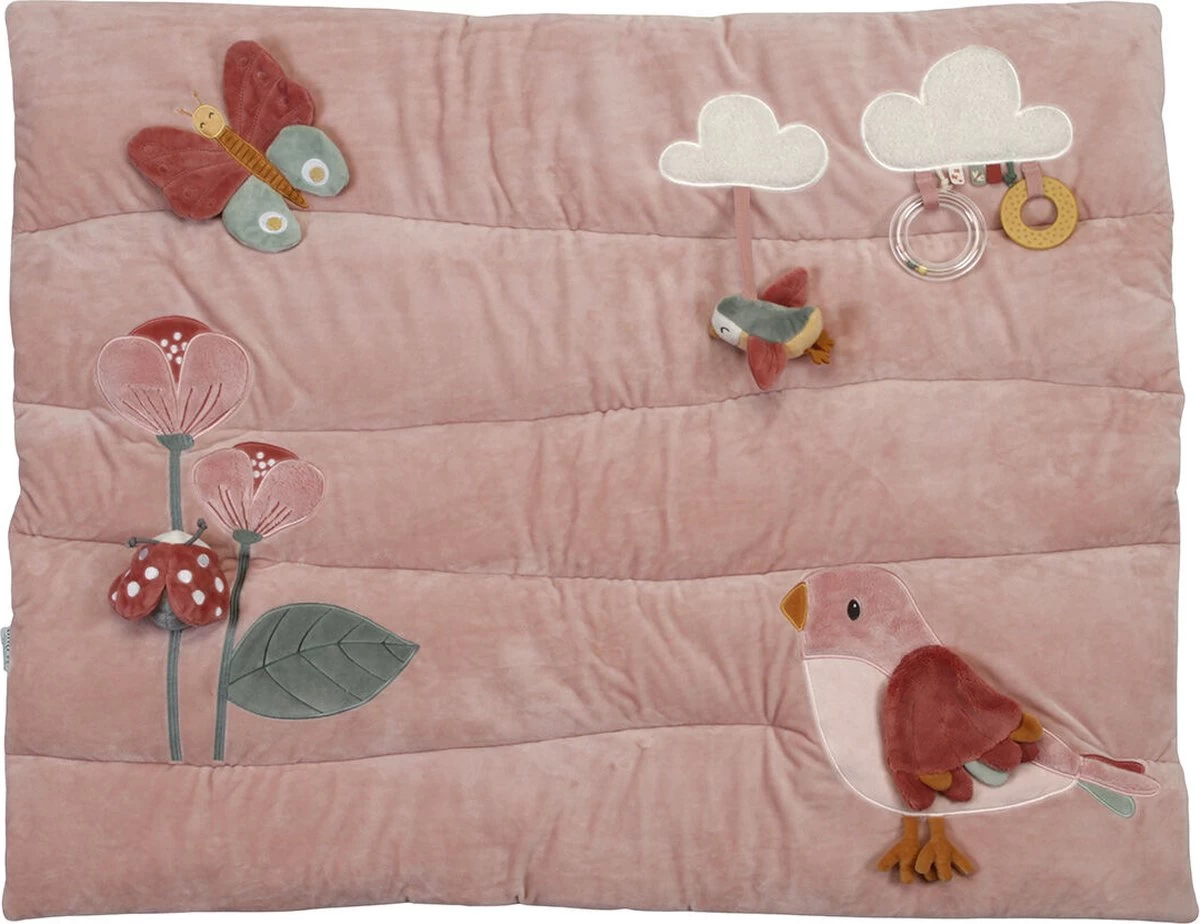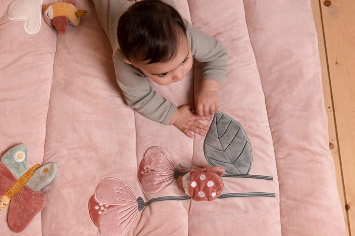 Op verkenning in het bloemenweide. Dit gewatteerde boxkleed zal de zintuigen van je kindje stimuleren met dank aan de vele verschillende texturen en activiteiten. Er valt zoveel te zien en te ontdekken voor kleine ontdekkingsreizigers. De roze vlinder heeft leuke, gekreukte vleugels en het kleine musje begint te rinkelen als je baby met haar speelt. Het boxkleed is daarnaast voorzien van een spiegeltje en beschikt over een transparante ring met 3 kleine kraaltjes die rammelen als ze verplaatsen.
