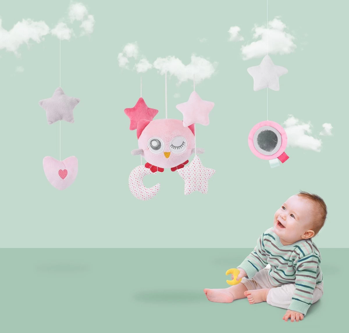 De muziekmobiel werkt rustgevend voor baby’s dankzij het lieve slaapliedje. Baby’s kijken graag naar de beweging van deze speeltjes, wat hun visuele en motorische ontwikkeling stimuleert. Het een kwestie van tijd voordat kindjes naar de vrolijke speeltjes van de boxmobiel zullen proberen te grijpen.