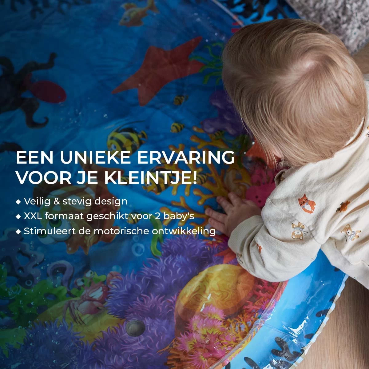De meeste watermatten zijn zo klein, dat deze niet eens genoeg ruimte bieden voor 1 baby om te spelen. Wij vinden het belangrijk dat jouw kindje alle ruimte heeft om zich te kunnen ontwikkelen. Daarom is ons speelkleed in XXL formaat en zelfs groot genoeg voor 2 baby’s om op te spelen.