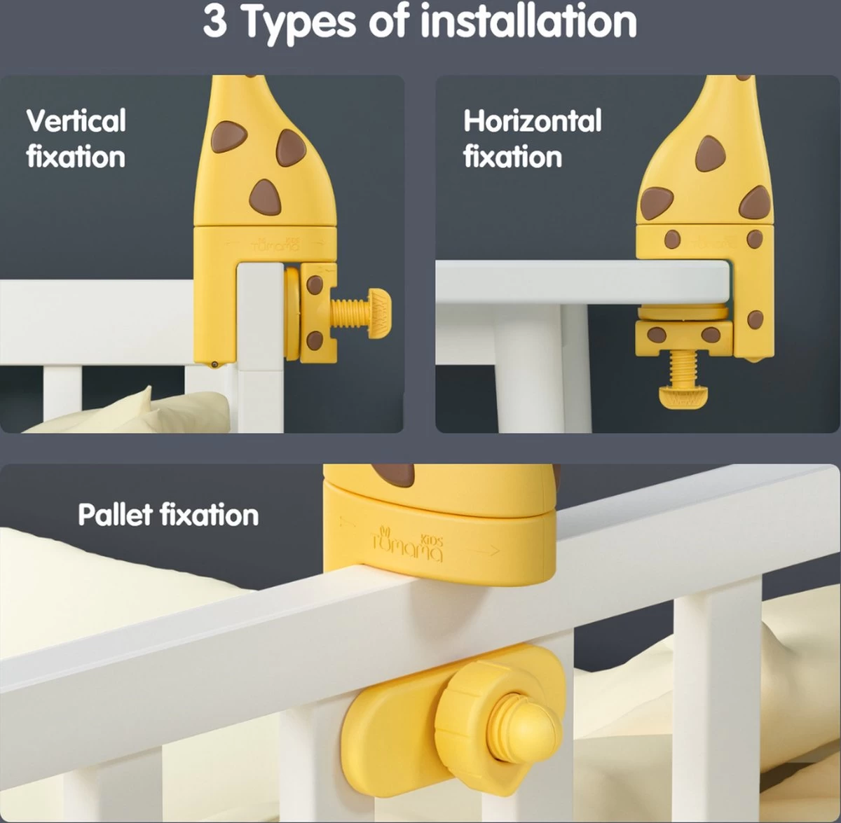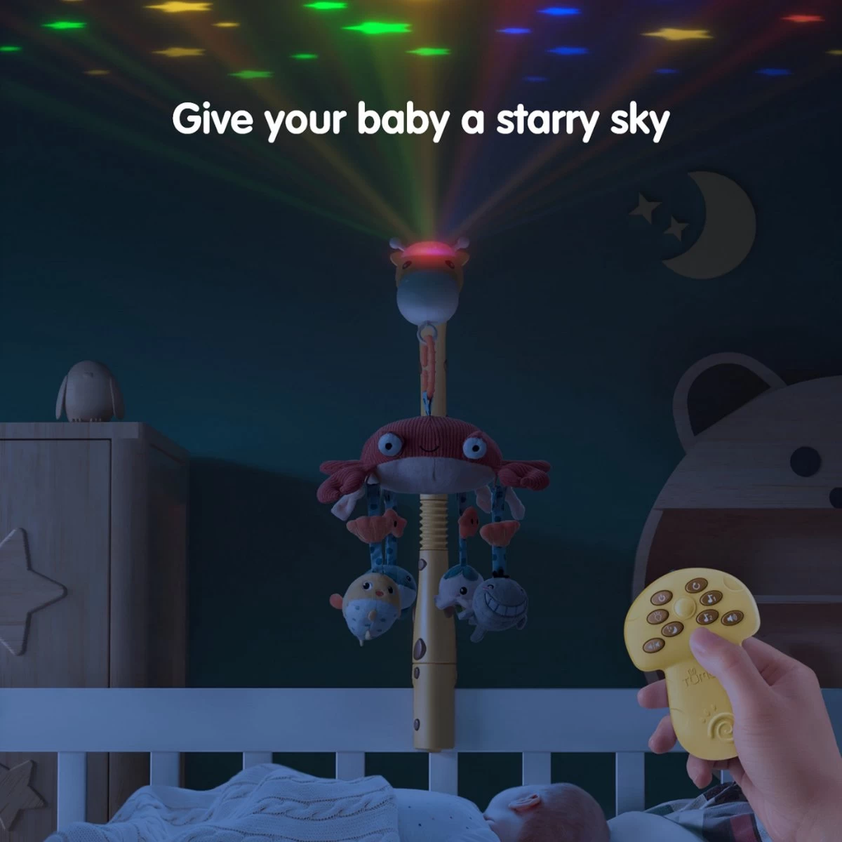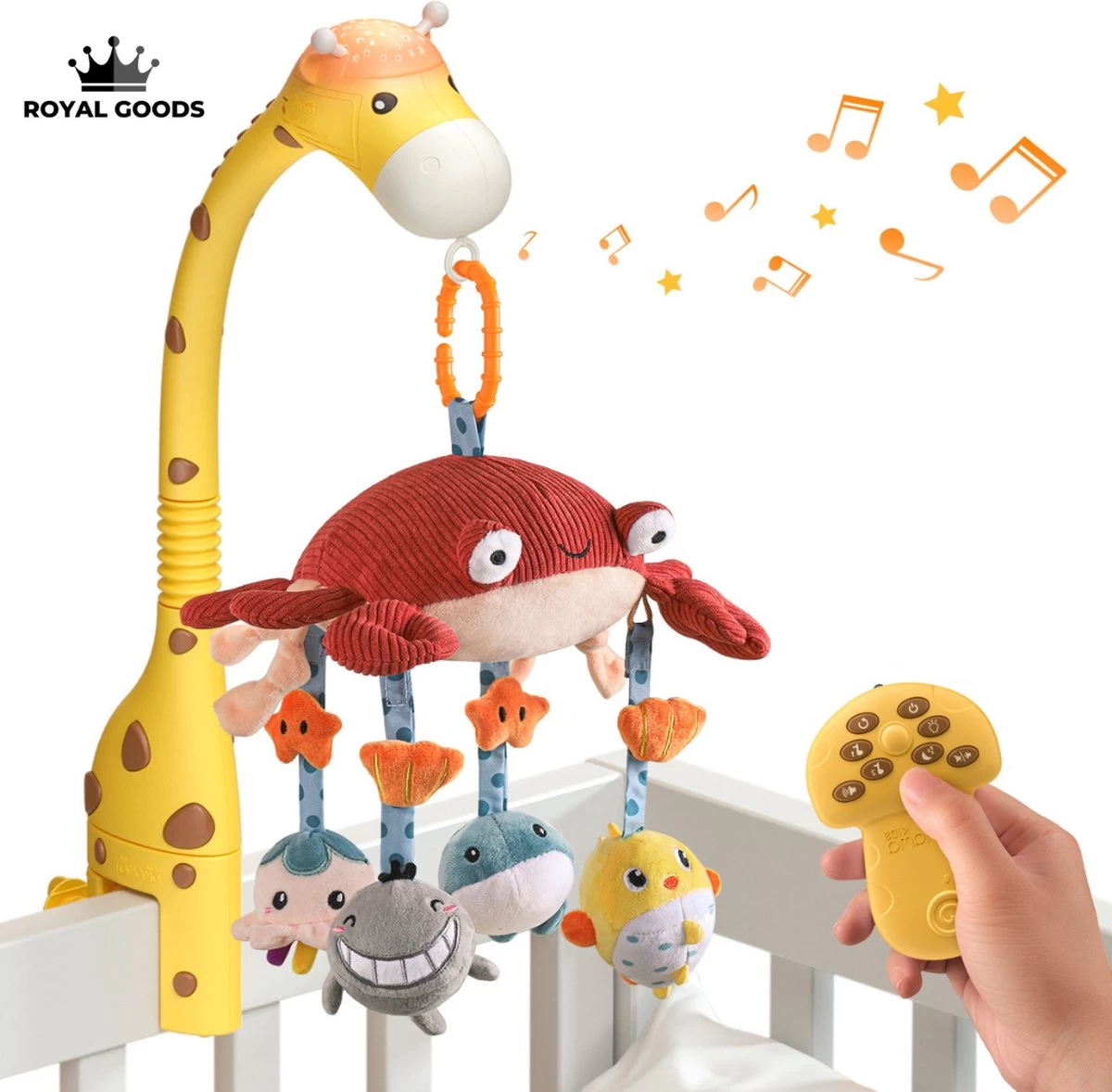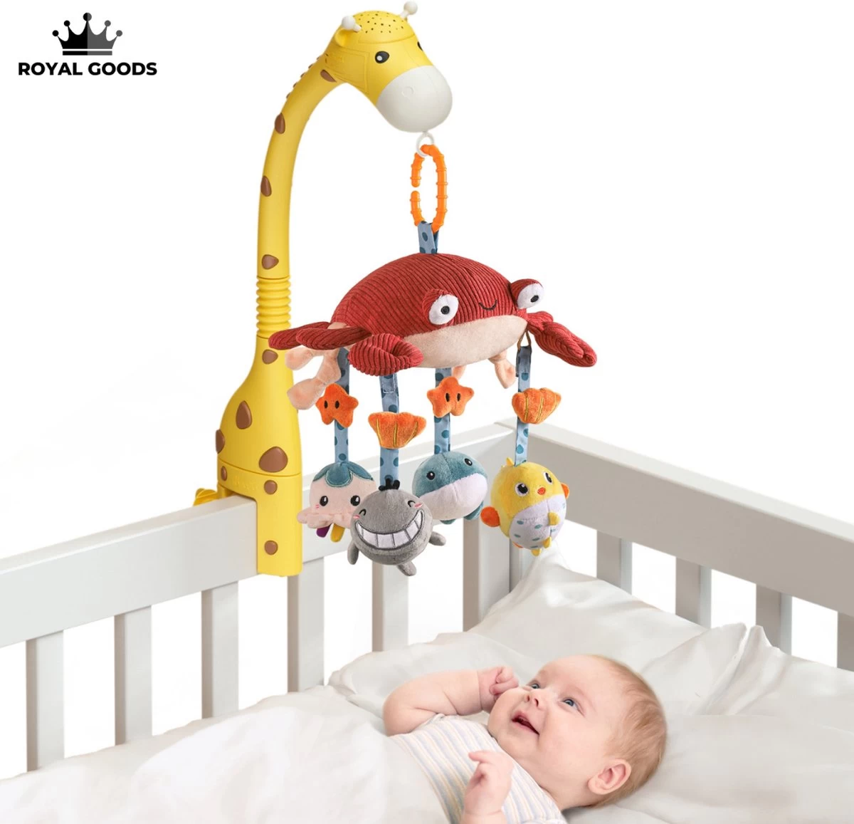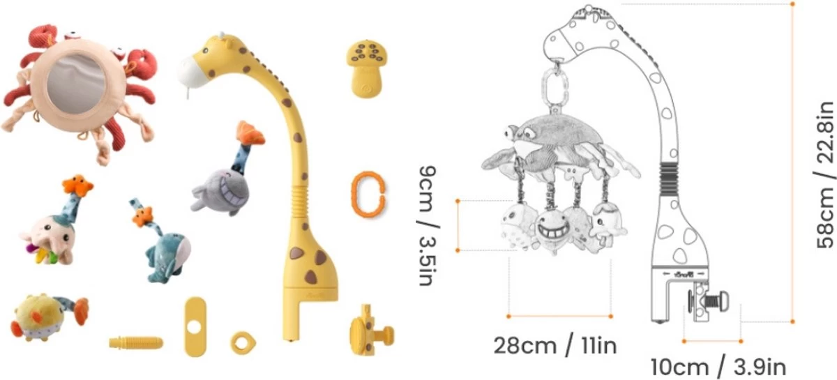 Deze vrolijke muziekmobiel helpt je kleine in slaap te vallen door middel van de diverse rustgevende slaapliedjes. De muziekmobiel bestaat uit een schattige giraffe, krab en nog wat leuke hangende speeltjes. Behalve dat kinderen het heerlijk vinden onder de gezelschap van een leuke muziekmobiel, stimuleert het ook de ontwikkeling van uw kind. De beweging van je muziekmobiel stimuleert o.a. de visuele ontwikkeling van de baby en is erg goed voor de ontwikkeling van de motoriek van de baby. De muziekmobiel is eenvoudig te bevestigen aan het kinderbed.