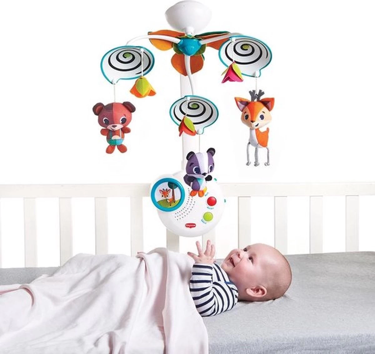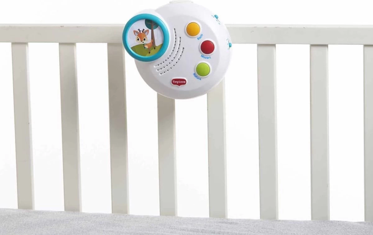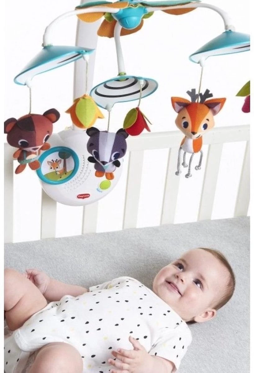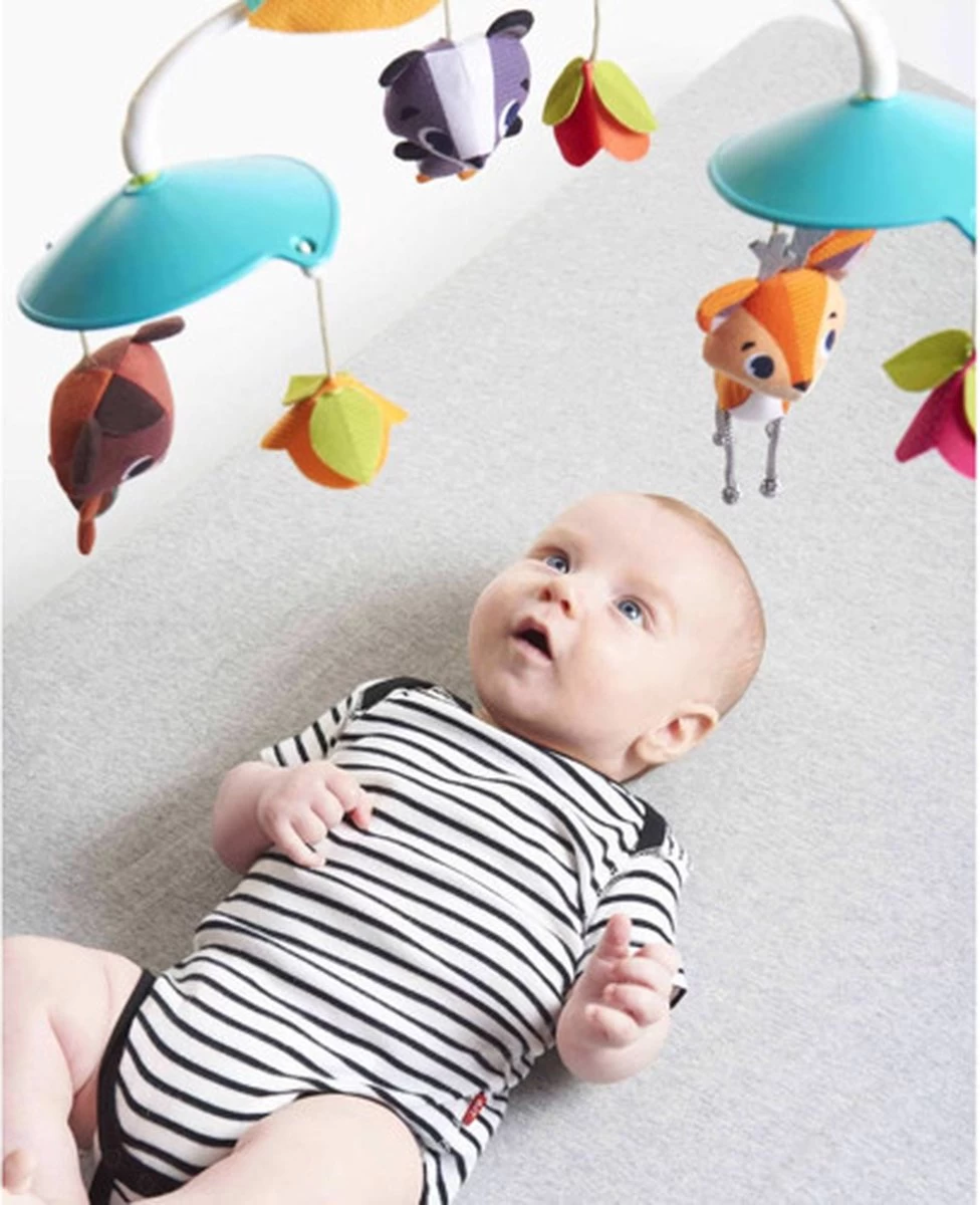 Bied je kleintje boeiende activiteiten, schattige bosvriendjes en een muzikale fopspeen met de Tiny Love Into the Forest Classic Mobile. Met deze slimme mobiel kunnen ouders het stimulatieniveau gemakkelijk matigen. Activeer de beweging, lichten en muziek allemaal samen of laat je baby kennismaken met één functie tegelijk; geniet van de volledige mobiele ervaring of verwijder de bovenarm en gebruik hem alleen als muziekdoos. Na 1-3 maanden kijkt je baby omhoog en kan nu de bewegende objecten met hun ogen volgen, waardoor het zicht wordt ontwikkeld en de oogspieren worden versterkt. Na 5 maanden kun je nu de arm van de mobiel verwijderen en de muziekdoos achterlaten zodat je baby er zelfstandig mee kan spelen.