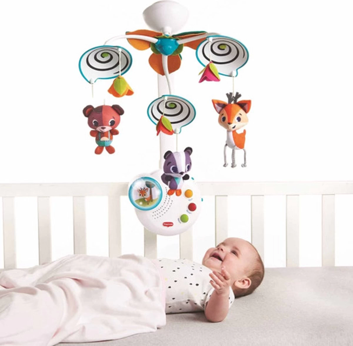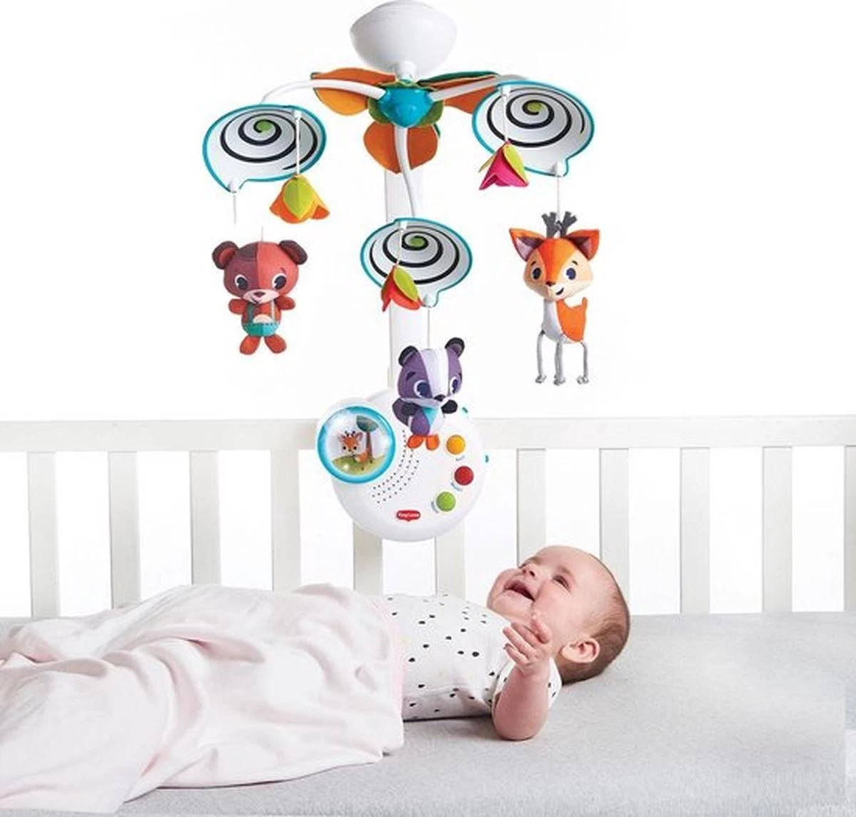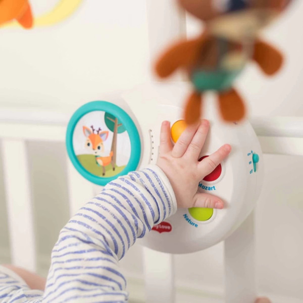 Bied je kleintje boeiende activiteiten, schattige bosvriendjes en een muzikale fopspeen met de Tiny Love Into the Forest Classic Mobile. Met deze slimme mobiel kunnen ouders het stimulatieniveau gemakkelijk matigen. Activeer de beweging, lichten en muziek allemaal samen of laat je baby kennismaken met één functie tegelijk; geniet van de volledige mobiele ervaring of verwijder de bovenarm en gebruik hem alleen als muziekdoos. Na 1-3 maanden kijkt je baby omhoog en kan nu de bewegende objecten met hun ogen volgen, waardoor het zicht wordt ontwikkeld en de oogspieren worden versterkt. Na 5 maanden kun je nu de arm van de mobiel verwijderen en de muziekdoos achterlaten zodat je baby er zelfstandig mee kan spelen.