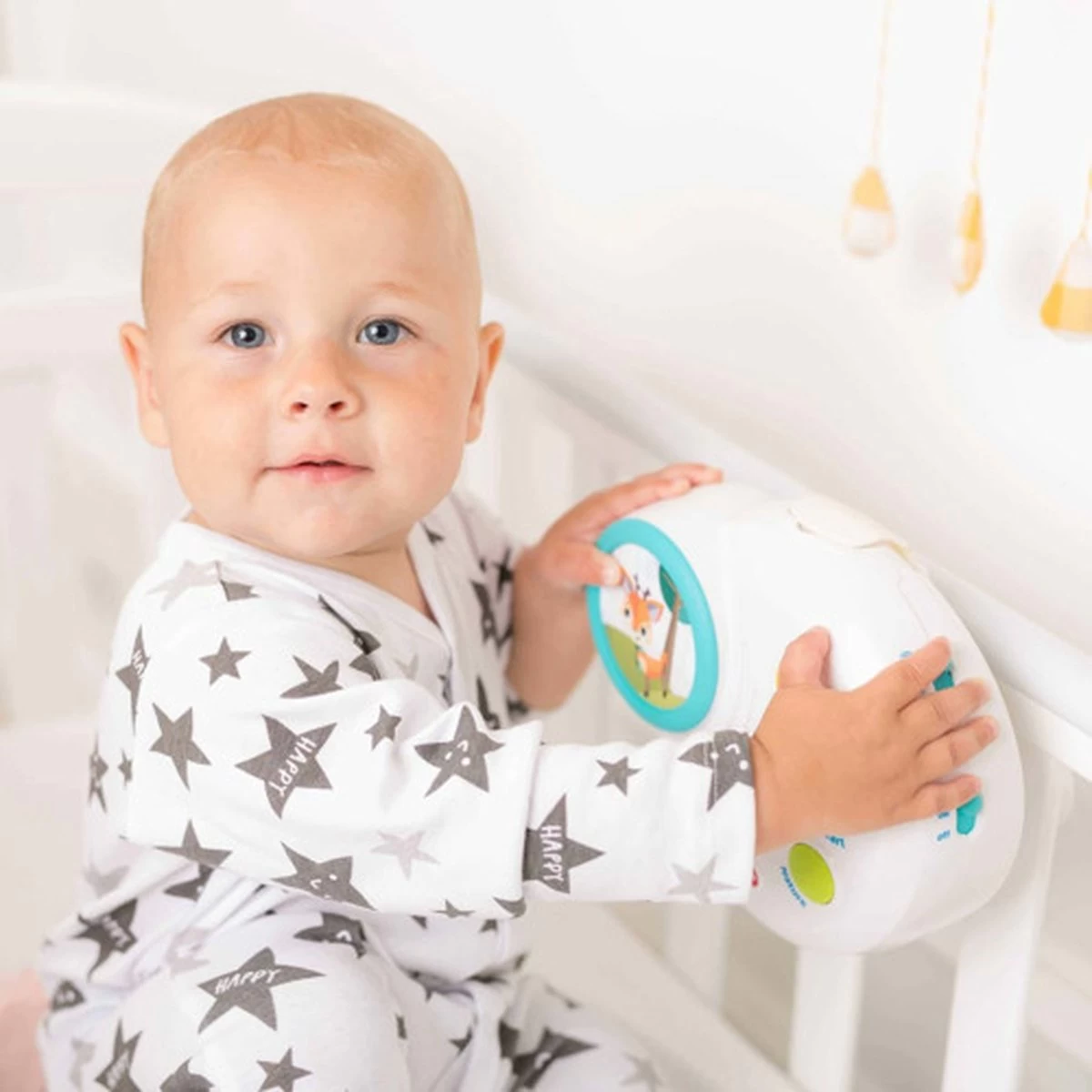 - Mobiel groeit mee met je baby en verandert in een op zichzelf staande muziekdoos wanneer de tijd voor mobieltjes voorbij is.
