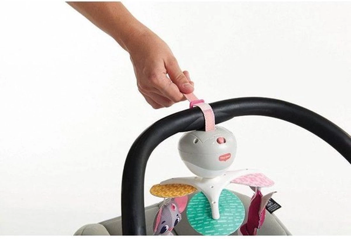 De Tiny Love Take Along Mobiel is een kleurrijke en boeiende mobiel die gemakkelijk overal mee naartoe gaat met je baby. Vanaf zeer jonge leeftijd zullen baby’s het gevoel van veiligheid en continuïteit waarderen dat wordt opgeroepen door deze mobiel overal mee naartoe te nemen. Het beschikt over 30 minuten met 5 verschillende melodieën om je kleintje te kalmeren en te amuseren. De kleurrijke hangende speeltjes draaien om je baby visueel te stimuleren. Deze aanpasbare mobiel is ontworpen om gemakkelijk aan de meeste speelterreinen, kinderwagens en wiegjes te worden bevestigd, zodat je hem overal mee naartoe kunt nemen, waar de dag jou en je baby ook brengt.