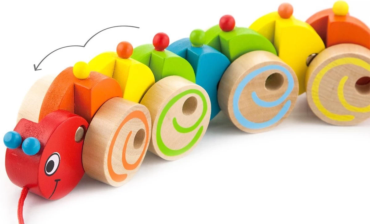 Trek zachtjes aan het koordje van deze vrolijk gekleurde rups en ga fijn een wandeling maken. Kleine voetjes komen in beweging om de vrolijke rups rond te zien draaien. Het koord is 70 centimeter. De aanbevolen leeftijd is 18 maanden en ouder.
