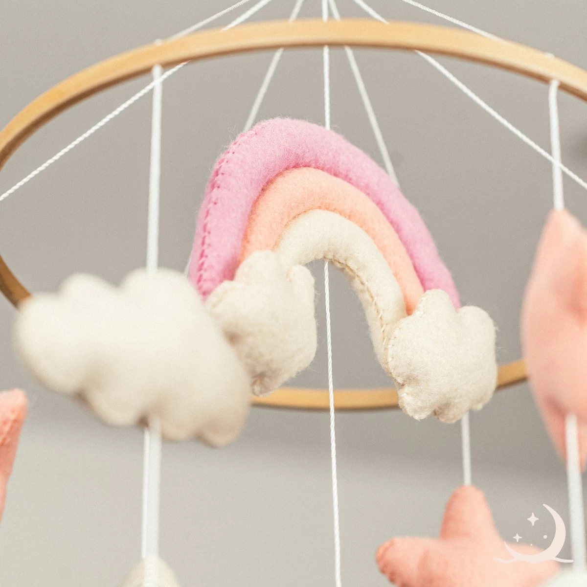 De zeedieren hangen aan een ring van bamboe en is versierd met wolkjes, zeesterren, bolletjes en een mooie regenboog.