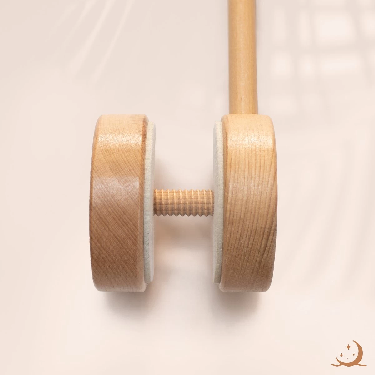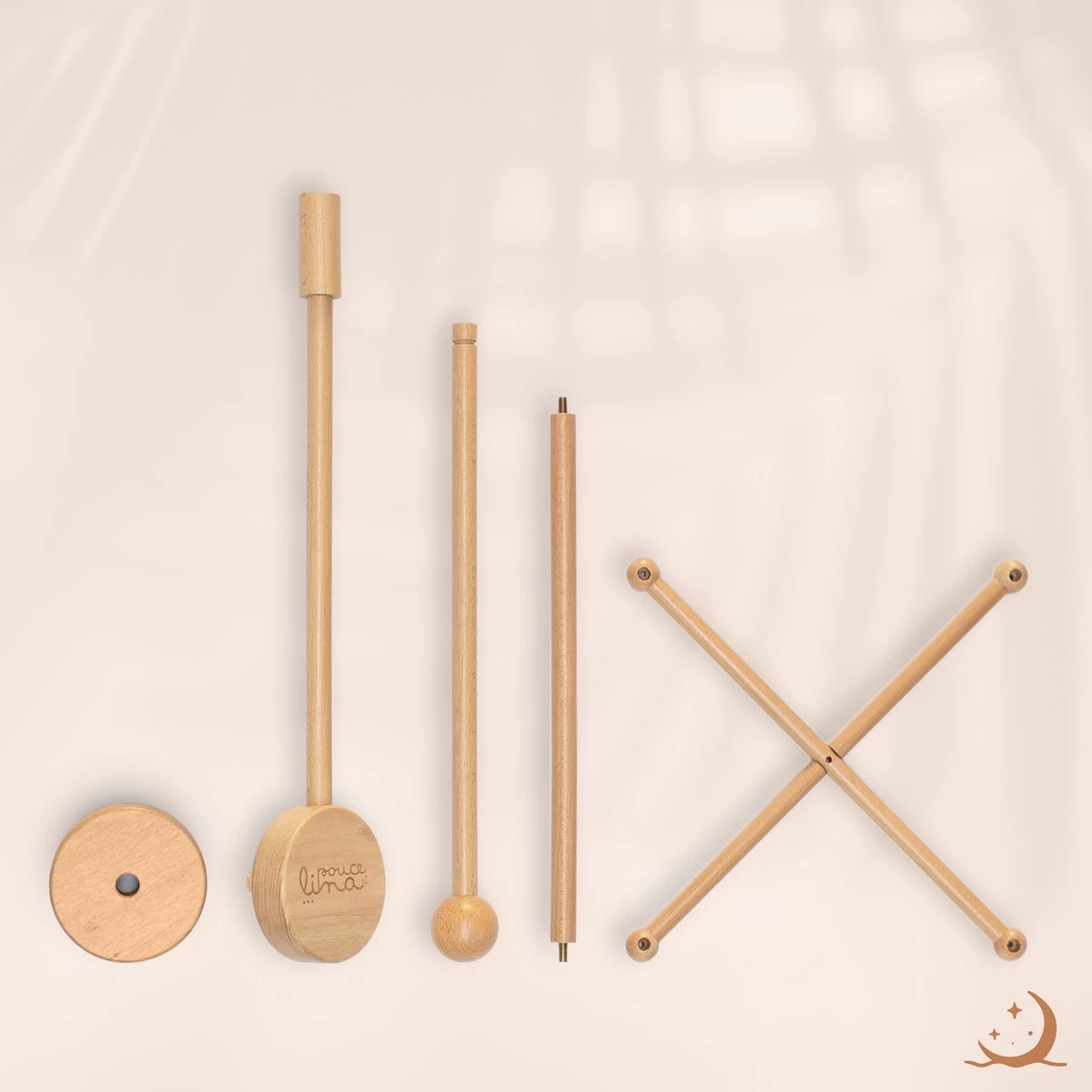 - Door middel van een schroef-mechanisme schroef je de houten mobiel arm gemakkelijk aan het babybedje of box.